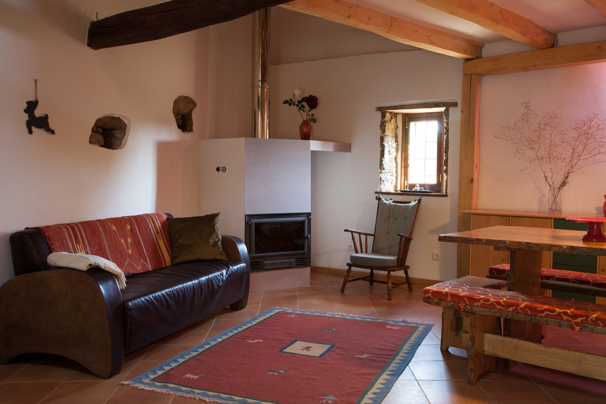 Quarto com cama de casal + mezzanine com duas camas. Por cima da sala há mais um quarto com uma cama de casa. Sala/cozinha com frigorifico, fogão, torradeira, louça, mesa com lugar para 8 pessoas, sofá, lareira. Casa de banho com duche. Entrada privada. Vista jardim.